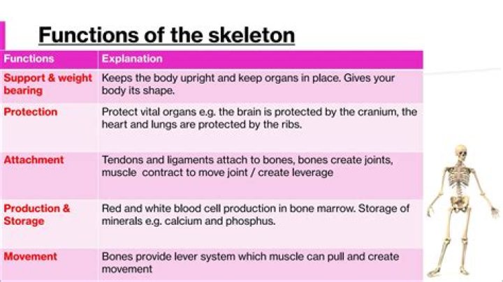 support and protect.Body movement.blood cell formation.storage of inorganic salts.