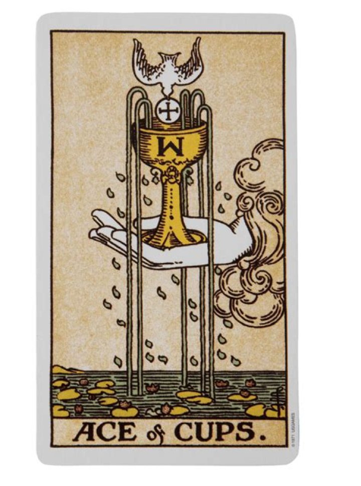 The Ace of Cups represents issues of love, intimacy, deeper feelings, and compassion. It announces the new beginning of great possibility in this area of life. It can mark the start of a new relationship, or a deeper connection to an existing one.