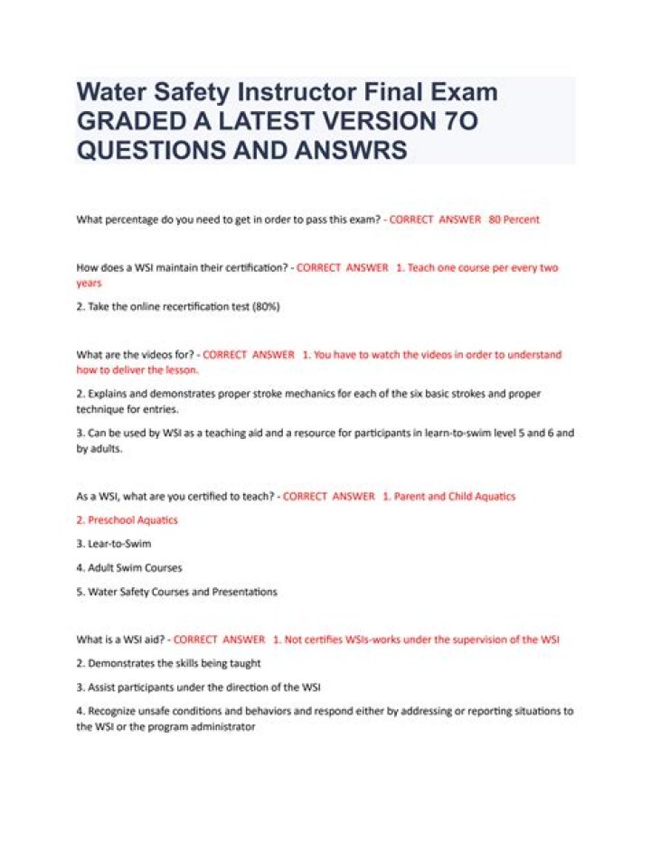 american red cross water safety instructor final written exam answers, check these out | How many questions is the WSI test?