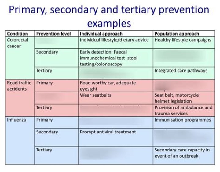 What are some examples of primary secondary and tertiary prevention?