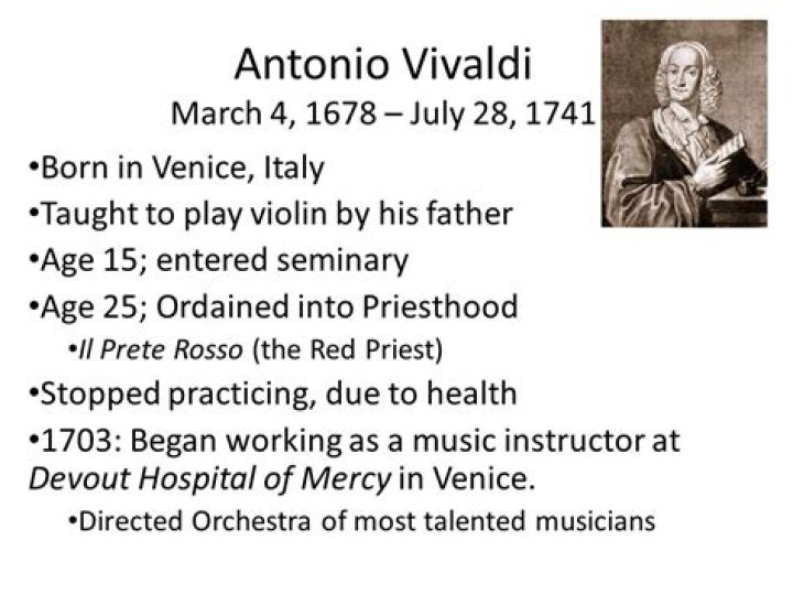 Antonio Lucio Vivaldi (4 March 1678–28 July 1741) was an Italian baroque composer, virtuoso violinist, teacher and cleric. Born in Venice, he is recognized as one of the greatest baroque composers, and his influence during his lifetime was widespread across Europe.