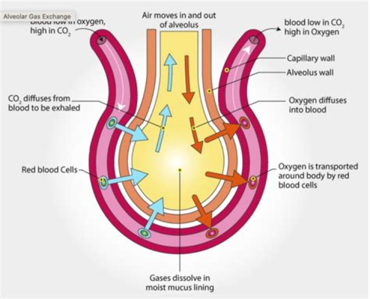 During gas exchange oxygen moves from the lungs to the bloodstream. At the same time carbon dioxide passes from the blood to the lungs. This happens in the lungs between the alveoli and a network of tiny blood vessels called capillaries, which are located in the walls of the alveoli.