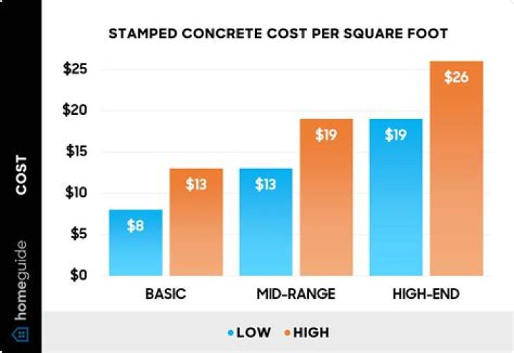 Stamped concrete typically costs between $9 and $16.25 per square foot, but high-end designs can cost $25.25 per square foot. Most homeowners can expect to spend between $9 and $16.25 per square foot for a stamped concrete slab.