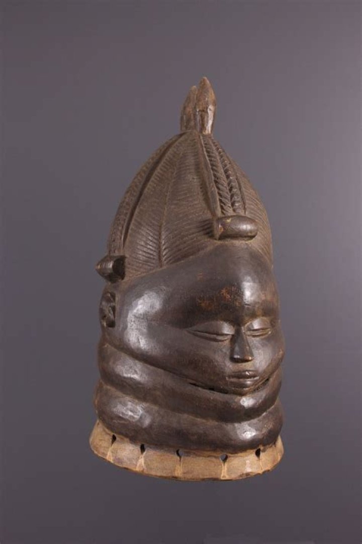 Within Mende and Sherbro culture, helmet masks are carved with symbolic features intended to endow the wearer with spiritual power. The masks are finely carved to convey admired feminine features: an elaborate coiffure, a smooth, broad forehead, narrowly slit eyes, a small, composed mouth, and a sensuously ringed neck.