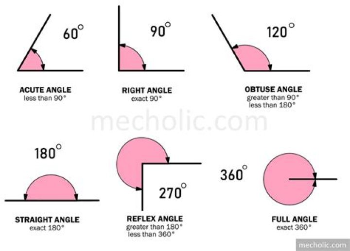 Right Angle – An angle that is exactly 90 degrees. Obtuse Angle – An angle more than 90 degrees and less than 180 degrees. Straight Angle – An angle that is exactly 180 degrees. Reflex Angle – An angle greater than 180 degrees and less than 360 degrees.