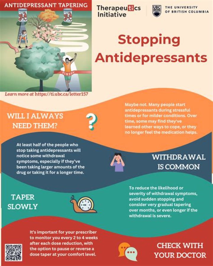 People should not stop taking antidepressants abruptly, as it could cause severe withdrawal symptoms. Strategies to minimize withdrawal symptoms include: Tapering off slowly: Doctors typically recommend that people reduce their dose of antidepressants gradually, usually over 4 weeks, but sometimes longer.