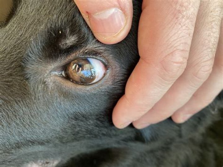 If there is a little bit of gooey discharge in the eyes but your dog can keep both eyes open and is not squinting or scratching its eyes (either with its paws or by rubbing its face on the floor) and otherwise seems well, you can cleanse the eyes with saline, remove the discharge, and apply some lubricating eye drops (
