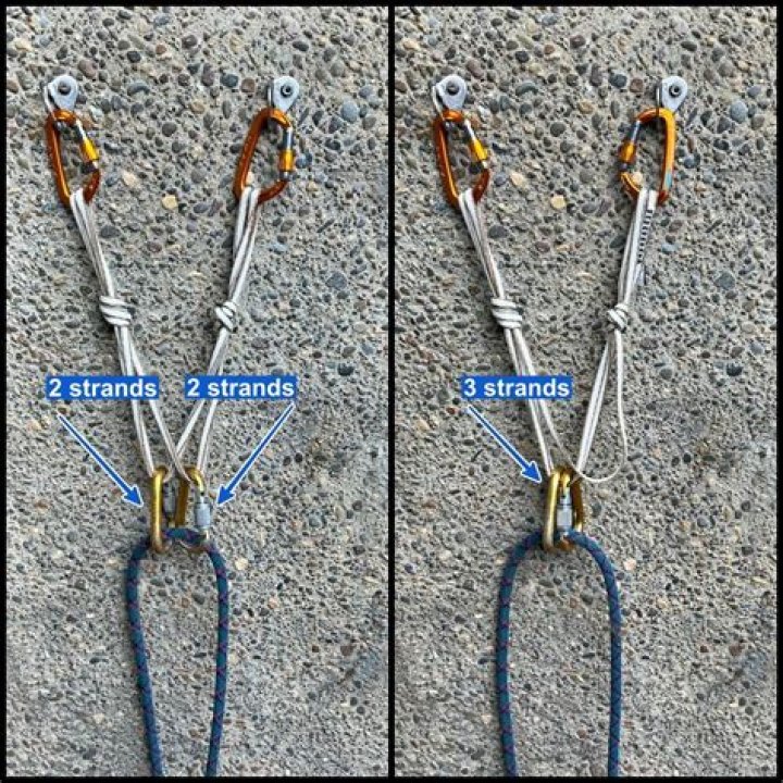The four-strand ‘master point’ should normally be around 12 inches long. These load-limiting knots minimize the distance the cordelette drops if one anchor point fails. The closer you tie these knots to the master point, the less shock-loading is applied to the remaining anchor point.