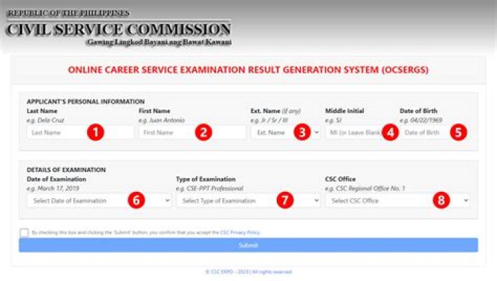 Go to csc OCSERGS website: Click this link ONLINE CAREER SERVICE EXAMINATION RESULT GENERATION SYSTEM (OCSERGS). Fill up necessary informations.Check the privacy policy and check the checkbox then submit.Now you can see your rating.You can also print your rating.