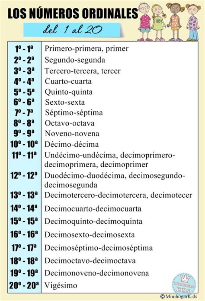 1, primero; 2, segundo; 3, tercero; 4, cuarto; 5, quinto; 6, sexto; 7, séptimo; 8, octavo; 9, noveno o nono; 10, décimo; 11, undécimo; 12, duodécimo; 13, décimo tercero; 14, décimo cuarto; 15, décimo quinto; 20, vigésimo; 21, vigésimo primo o primero; 22, vigésimo segundo; 30, trigésimo; 40, cuadragésimo; 50,
