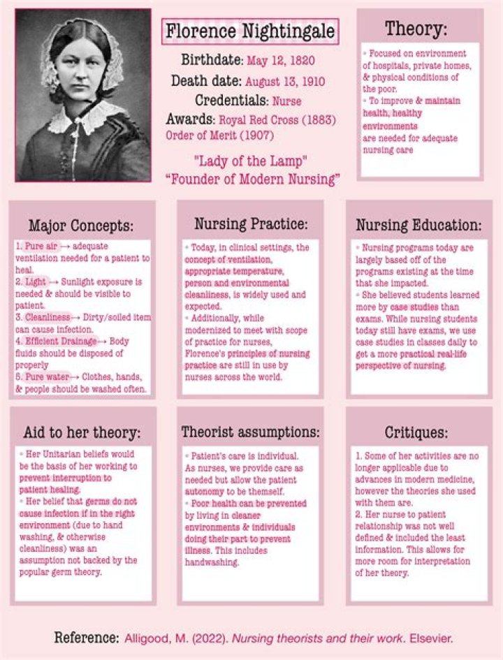 The Environmental Theory, by Florence Nightingale, described nursing as “the act of utilizing the environment of the patient to assist him in his recovery.” Florence identified five environmental factors: fresh air, pure water, efficient drainage, cleanliness or sanitation, and light/direct sunlight which put the …