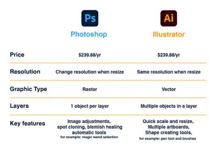 The most significant difference is that Adobe Photoshop is a raster graphics software while Adobe Illustrator is a vector graphics software. As such, the file formats used for each tool are also different.