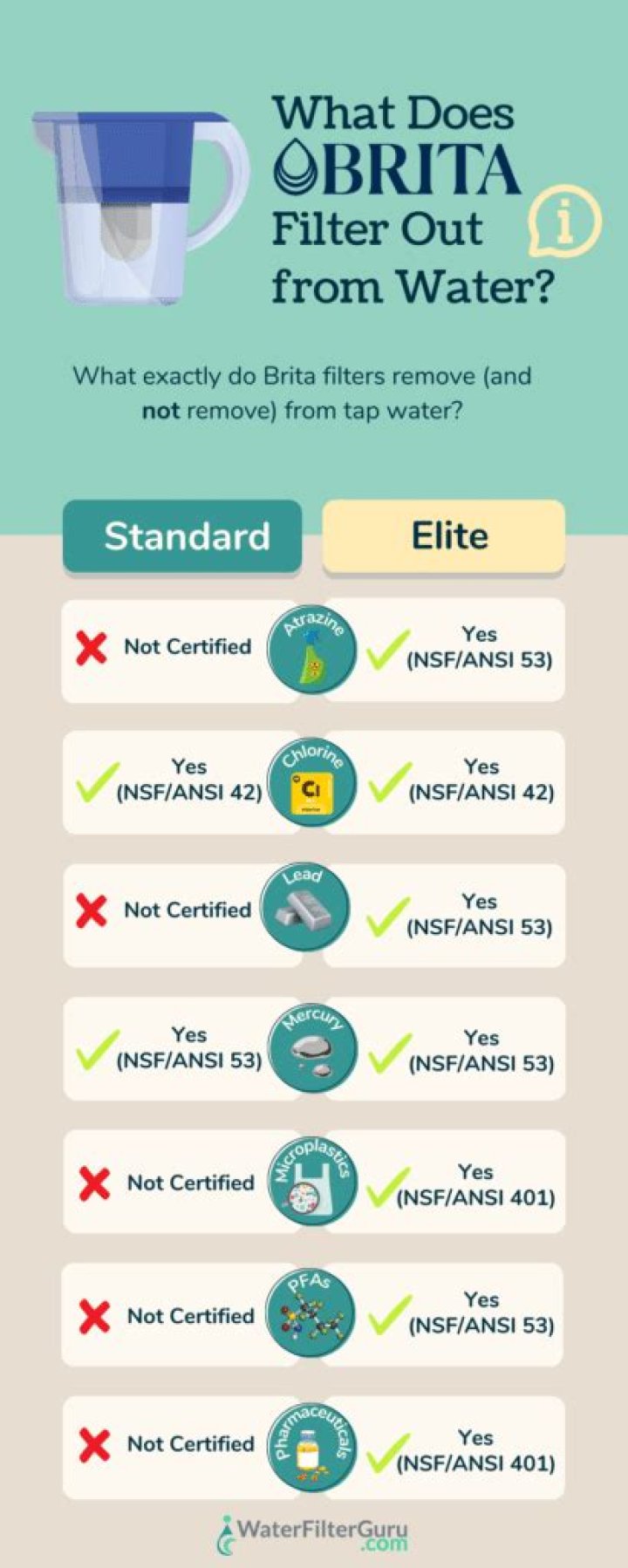 Brita products are certified by the National Sanitation Foundation (NSF), which means they meet the requirements for providing safe drinking water. Brita filters are also certified under the Water Quality Association (WQA) Gold Seal Product Certification Program.