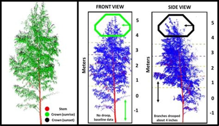 One hour after sunset, tree branches start dangling and continue doing so throughout the night, reaching their lowest point about 9-11 hours after sunset, new research published in the journal Frontiers in Plant Science has found.