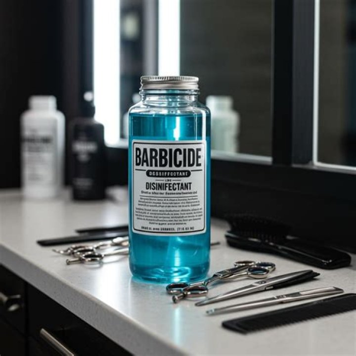 Barbicide is a disinfectant solution used by barbers and cosmetologists for disinfecting grooming tools such as combs and hair-cutting shears.