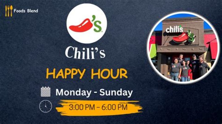 Chili’s Happy Hour. You can find Happy Hour specials at most Chili’s locations. … Happy Hour on Food Items: Mon – Thu: 3 PM – 7 PM & 9 PM – Close, Fri: 3 PM – 7 PM, and Sun: All Day. Happy Hour on Drinks: All day every day, in the bar only.