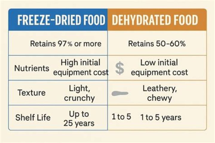 Freeze-dried foods retain the vast majority of the vitamins and minerals found in their original state. Freeze-dried food retains its nutrition because of the “cold, vacuum” process that is used to extract the water. Whereas, the nutritional value of dehydrated food is generally around 60% of equivalent fresh food.