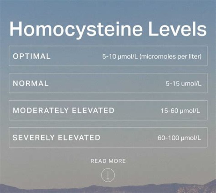 In a healthy person, homocysteine levels are around five to 15 micromoles per liter (mcmol/L). Nearly all that homocysteine converts to other proteins. If you have more than 50 mcmol/L, the excess homocysteine may damage the lining of your arteries (blood vessels that carry oxygen-rich blood throughout your body).