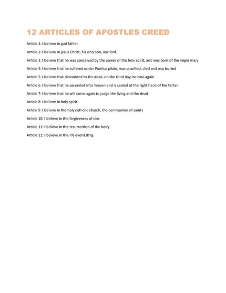 If you want to know the basics of the Catholic faith, look no further than the articles of Catholic faith. This list of twelve articles mirrors the Apostles’ Creed, a prayer that sets out Catholic tenets: Article 1: I believe in God, the Father Almighty, Creator of heaven and earth.