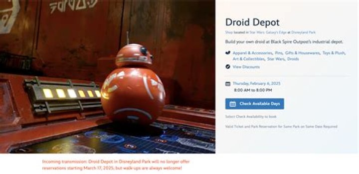 Advance reservations for Droid Depot are highly recommended. A valid, accepted credit card number is required at the time of booking. Payment will be due upon arrival at the location. A limited number of same-day reservations may be available up to 2 hours in advance.