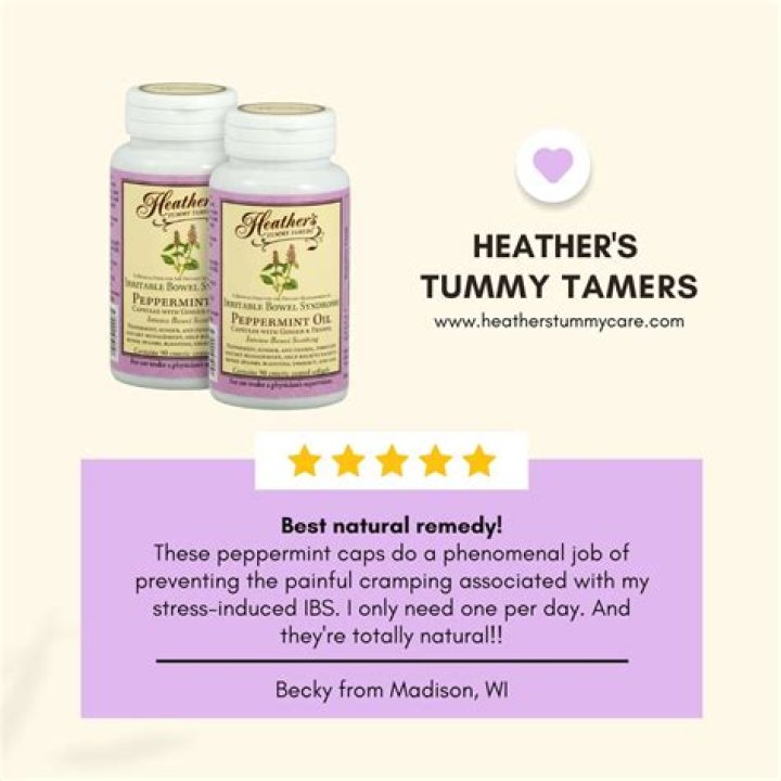 Details. Heather’s Tummy Tamers Peppermint Oil Capsules for IBS are an enteric-coated blend of peppermint, fennel, and ginger oils that soothe and relax the digestive tract. Peppermint, as part of the diet, helps relieve abdominal pain, diarrhea, and urgency from IBS.