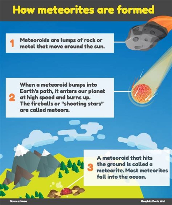 Meteorites are “space rocks”, which are found on Earth after they fall from the sky. Travelling this fast makes the space rocks very hot – more than 1000℃! And that makes them shine, like a star – which is why people call them “shooting stars”. Most meteors are tiny, and burn up as they fall toward Earth.