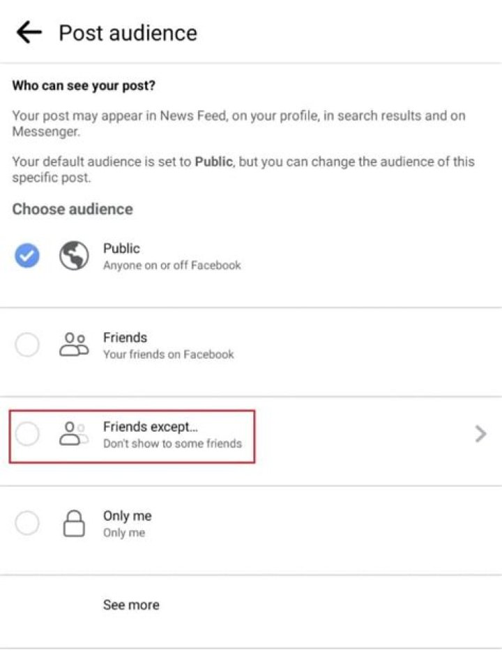 When you choose to share something to friends except acquaintances, it will exclude people you’ve added to your acquaintances list from the post’s audience.