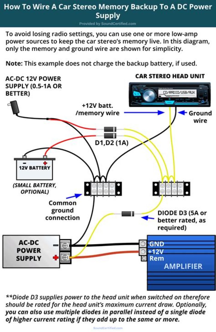 Most stereos have 2 power wires (one switched and one constant) and 1 ground wire. Splice both power wires to the positive wire of the power supply and the ground wire to the negative. Make sure you connect both power wires because it won’t work with only one. Plug in the power supply and you are good to go!