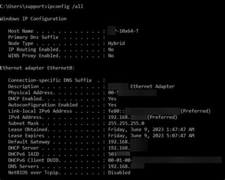 ipconfig /all displays all configuration information for each adapter bound to TCP/IP.