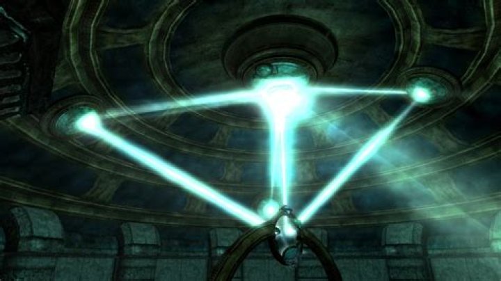 Once each light beam is on a different ring in the ceiling, go up to the top where the buttons are and press each of them a bunch until they rotate around and the beams of light are on the crystal circles. Then hop down and talk to the synod guy.