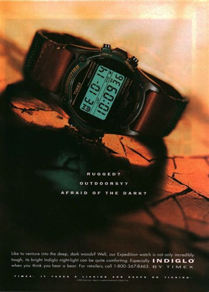 Though most typically used in digital watches, Timex’s Indiglo is the most prominent analog watch to feature this form of ‘backlight’ illumination. Timex patented the technology in 1992, making it one of the few analog watch manufacturers with this form of lume.