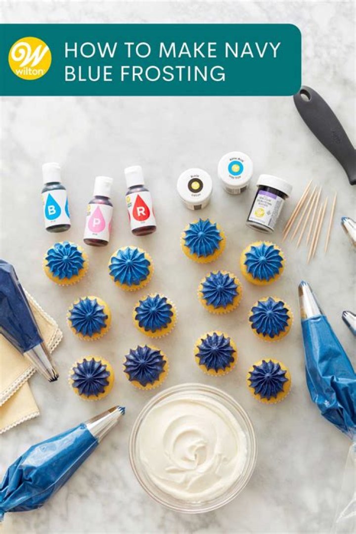 For every half cup of frosting add three drops royal blue, three drops violet and one small drop black. This will allow you to achieve a navy blue color in your buttercream frosting.
