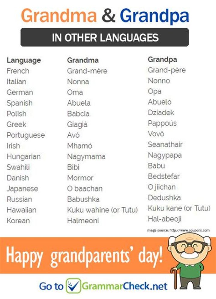 “Nonna” from Italian.“Obaasan” from Japanese.“Oma” from German.“Vovo” from Portuguese.“Babcia” from Polish.“Abuela” from Spanish.