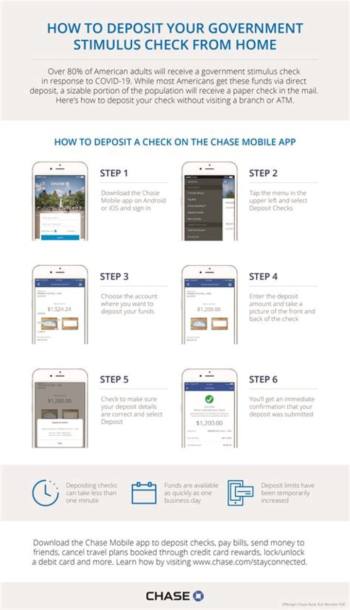 You can deposit checks remotely using Chase QuickDepositSM. We’ve increased its limits to: $10,000 daily and $25,000 in a rolling 30-day period using the Chase Mobile app.
