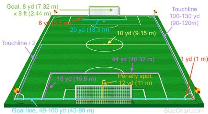 Not all pitches are the same size, though the preferred size for many professional teams’ stadiums is 105 by 68 metres (115 yd × 74 yd) with an area of 7,140 square metres (76,900 sq ft; 1.76 acres; 0.714 ha).