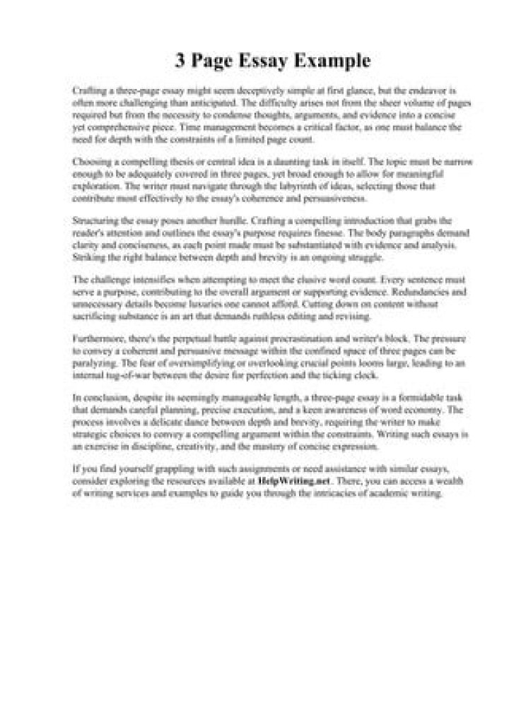 Three pages is about the standard length for middle school essays and shorter high school reports. Three pages provides authors enough space to construct and develop their arguments and write a short introduction and conclusion. A three-page essay in 12 point font, double-spaced, is not much writing (about 750 words.)