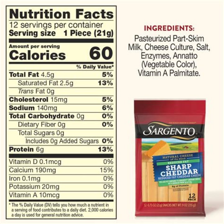 Per Stick: 80 calories; 3 g sat fat (16% DV); 180 mg sodium (8% DV); less than 1 g total sugars. 7 g of protein per serving.