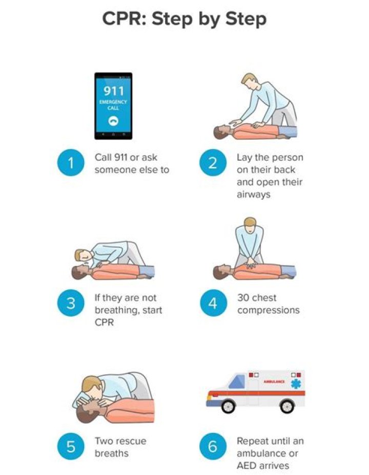 Using your upper body weight, push straight down on the chest about 2 inches (5 centimeters), but not more than 2.4 inches (6 centimeters). Push hard at a rate of 100 to 120 compressions a minute.