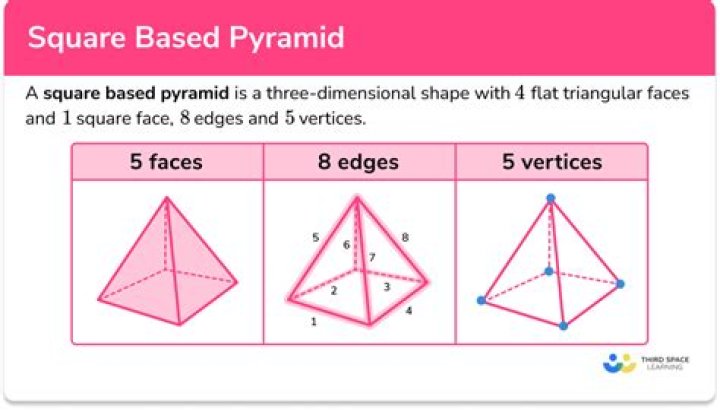 A square-based pyramid has 8 edges. A square-based pyramid has 5 vertices. A vertex is a point at which two or more edges meet.