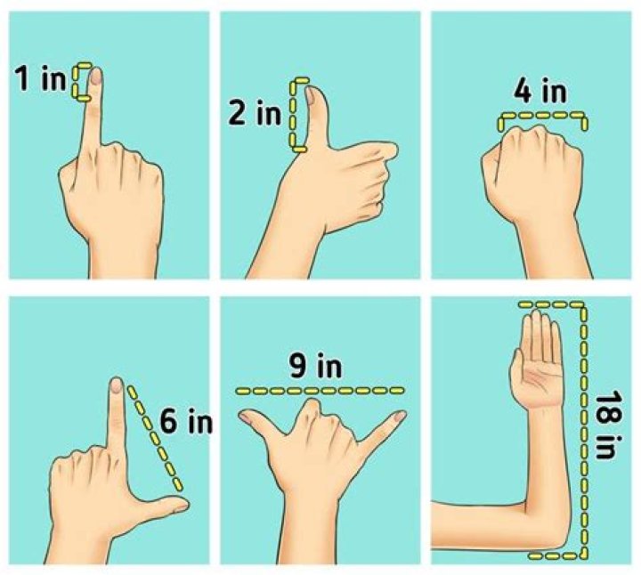 * Use your own body for fast, approximate measuring. The first joint of an index finger is about 1 inch long. When a hand is spread wide, the span from the tip of the thumb to the tip of the pinkie is about 9 inches; from the tip of the thumb to the tip of the index finger, around 6 inches.