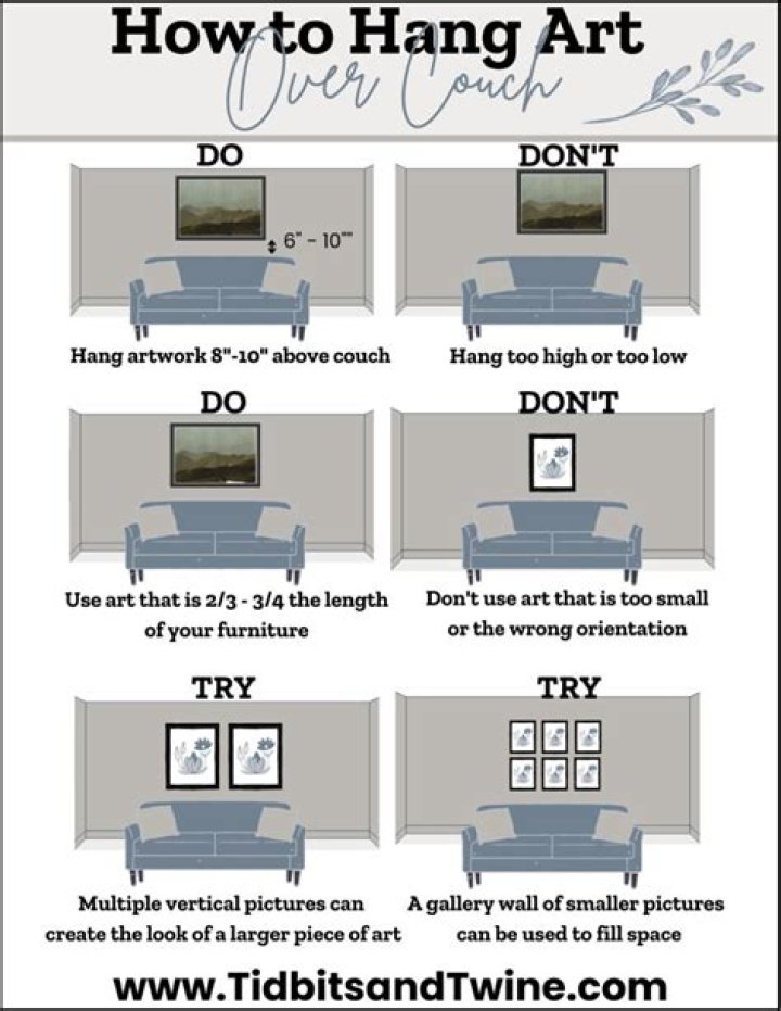 Artwork should be centered over the furniture such as a sofa, bed or mantel. Artwork placed above a main piece of furniture in the room should be placed no more than six inches above the piece of furniture in order to make them appear cohesive.