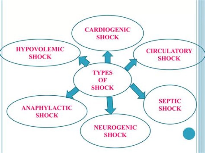 Cardiogenic shock (due to heart problems)Hypovolemic shock (caused by too little blood volume)Anaphylactic shock (caused by allergic reaction)Septic shock (due to infections)Neurogenic shock (caused by damage to the nervous system)