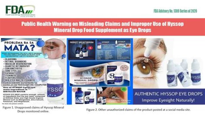 The Food and Drug Administration (FDA) hereby warns the public on misleading claims and inappropriate use of the product HYSSOP MINERAL DROPS MINERAL BLEND FOOD SUPPLEMENT DROPS registered under FDA as a food supplement with no approved therapeutic claims.