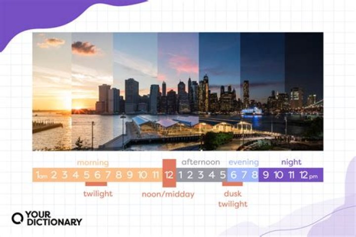 Sunrise typically occurs around 6 AM. Noon is at 12:00 PM. Afternoon is from 12:01 PM to around 5:00 PM. Evening is from 5:01 PM to 8 PM, or around sunset.