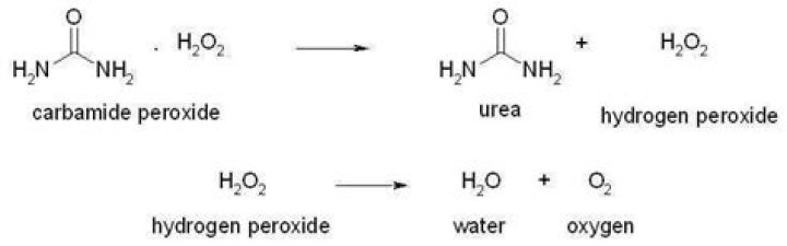 Hydrogen peroxide alone is an effective whitening agent. Carbamide peroxide—also an effective whitening agent—contains hydrogen peroxide at a ratio of 1:3. Hydrogen peroxide breaks down faster than carbamide peroxide, so it releases most of its whitening power within 30–60 minutes.