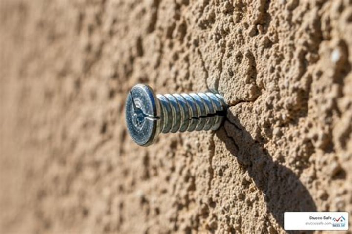 Step 1: Mark the area of the screw placement. Step 2: Make a pilot hole with a drill. Step 3: Optional, put caulk in the hole. Step 4: Optional, place a screw anchor in the hole. Step 5: Drive in the stucco screw.