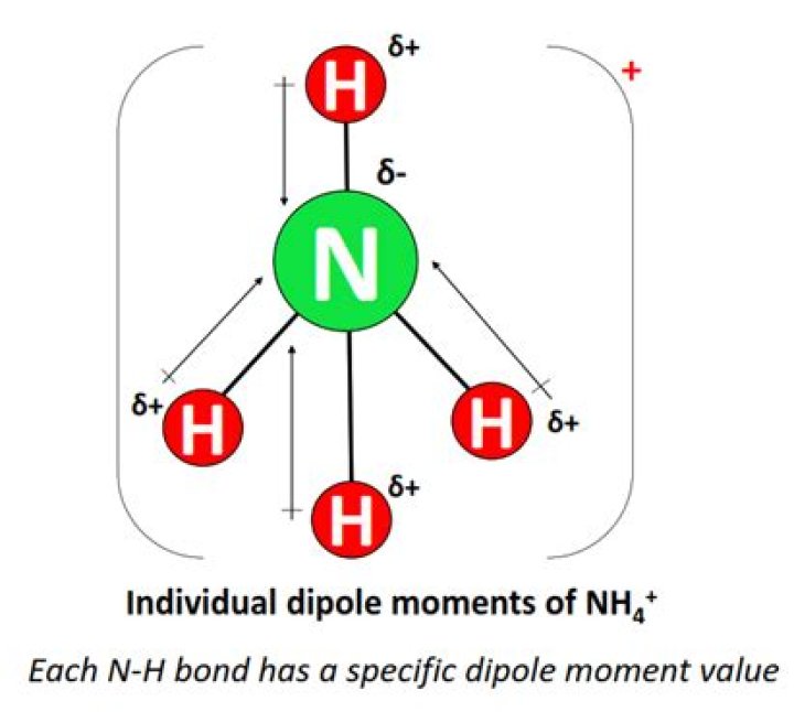 Dipole Moment: The dipole of a molecule is the measure of its polarity. The polar molecule always has its dipole equals to non zero. And the nonpolar molecules have net dipole equals to zero. Similarly, the dipole of NH4+ (Ammonium ion) is 0 D.