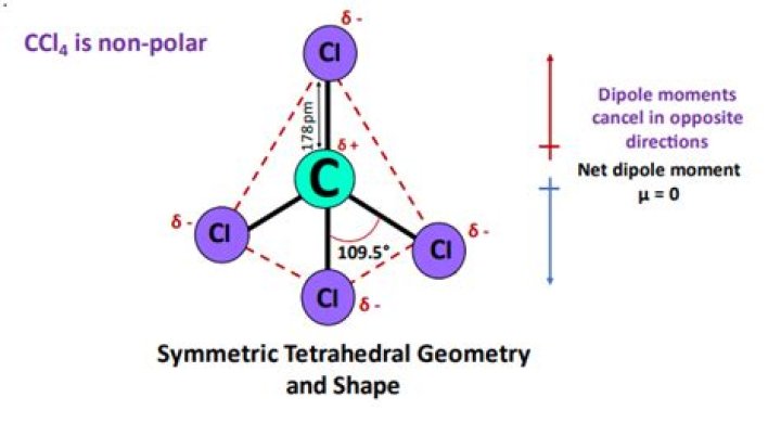 CCl4 that is carbon tetrachloride is nonpolar because all the four bonds are symmetrical, and they are they extended in all the directions. This makes it easy for the dipole moments in each direction to cancel out.