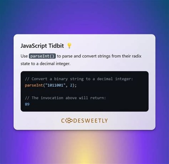 The parseInt method parses a value as a string and returns the first integer. A radix parameter specifies the number system to use: 2 = binary, 8 = octal, 10 = decimal, 16 = hexadecimal.