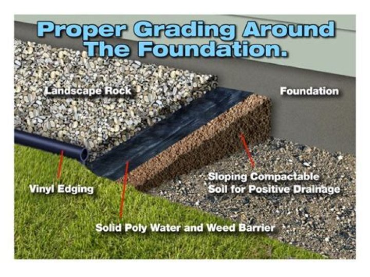 Soils with good drainage are the best kind to cover with decorative gravel around building foundations. The soil, however, always must slope away from the foundation to ensure proper drainage; a minimum of 6 inches of drop for the 10 feet adjacent to the building is necessary.